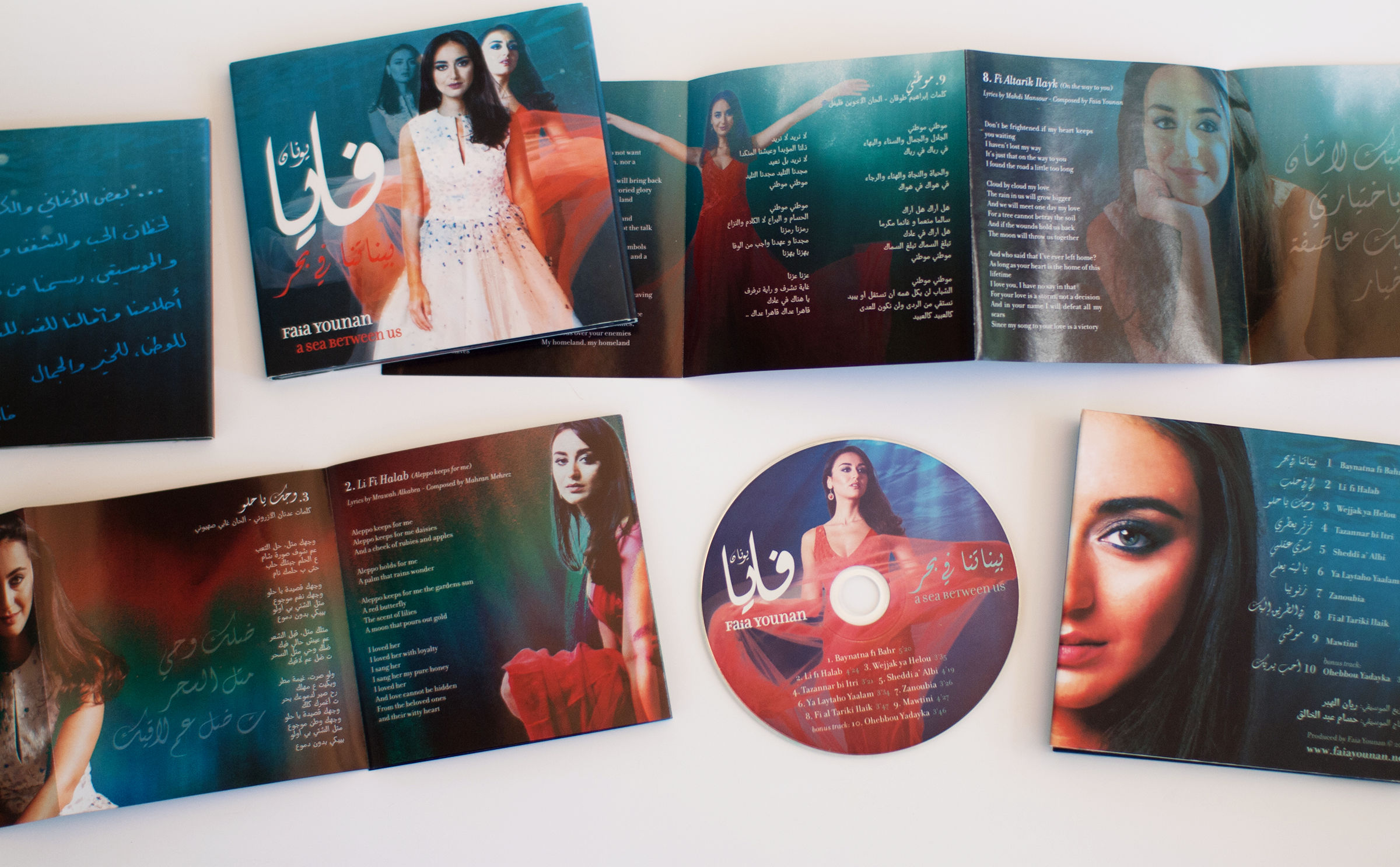 Nous avons créé le graphisme et la mise en page du premier album de Faia Younan. Les tonalités bleues rappellent la mer, thème inspiré du nom de l’album « A sea between us », et nous plongent dans une impression de rêve marin.